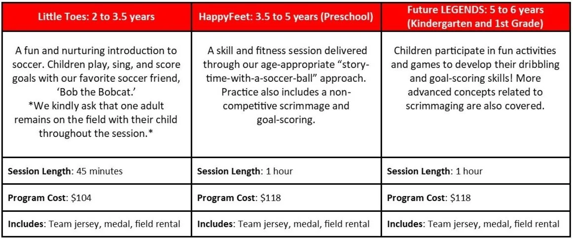 UNIFORM: Each child will receive a jersey. Soccer cleats are preferred but tennis shoes work too. Children participating in HAPPYFEET and FUTURE LEGENDS should wear shin guards.